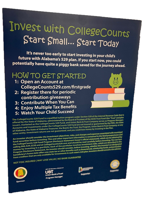 The Alabama State Treasurer’s Office, Savings Division, in partnership with the Alabama State Department of Education, wanted to introduce the CollegeCounts 529 Fund to every first grade public school student in Alabama and their families. The goal was to encourage parents to invest in the 529 fund in order to prepare their children for future education plans.