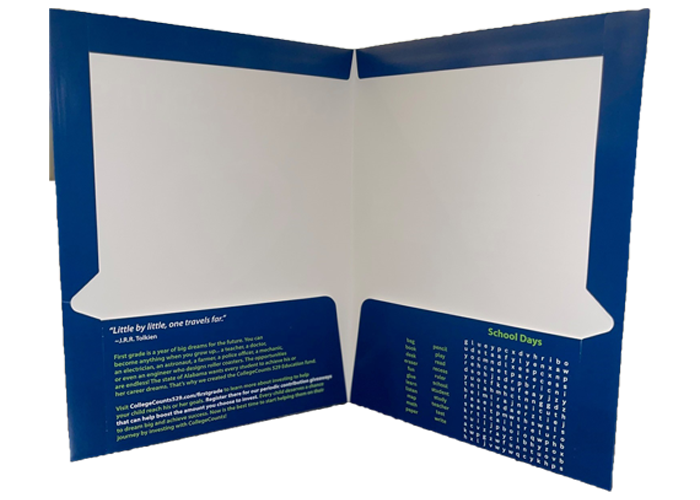 Working with the Director of Savings Division to create beautiful custom folders for every first grader to receive on the first day of school to take home with their daily work. The folders highlighted the importance of contributing to CollegeCounts 529 Education fund while incorporating fun and exciting elements for students, like a word search puzzle and colorful graphics. While shutdowns put a hold on distributing the folders in 2020, LogoBranders was able to store them throughout the pandemic and deliver to every public elementary school in the state of Alabama in time for the start of the 2021 school year.
